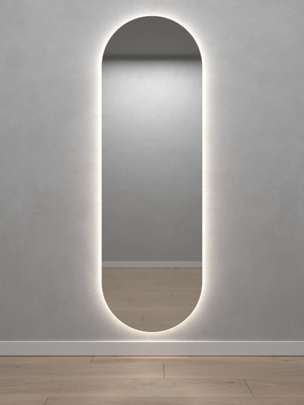 Безрамное зеркало овальной (капсульной) формы с контурной (тыльной) нейтральной подсветкой, свет 4000К. Подложка из высококачественного МДФ, светодиодная лента защищена матовым свето-рассеивателем от попадания пыли и влаги. Есть вывод 220W для подключения к сети, включение подсветки от выключателя на стене, либо от розетки. Возможно установить сенсорную кнопку на заказ в любом месте зеркала.